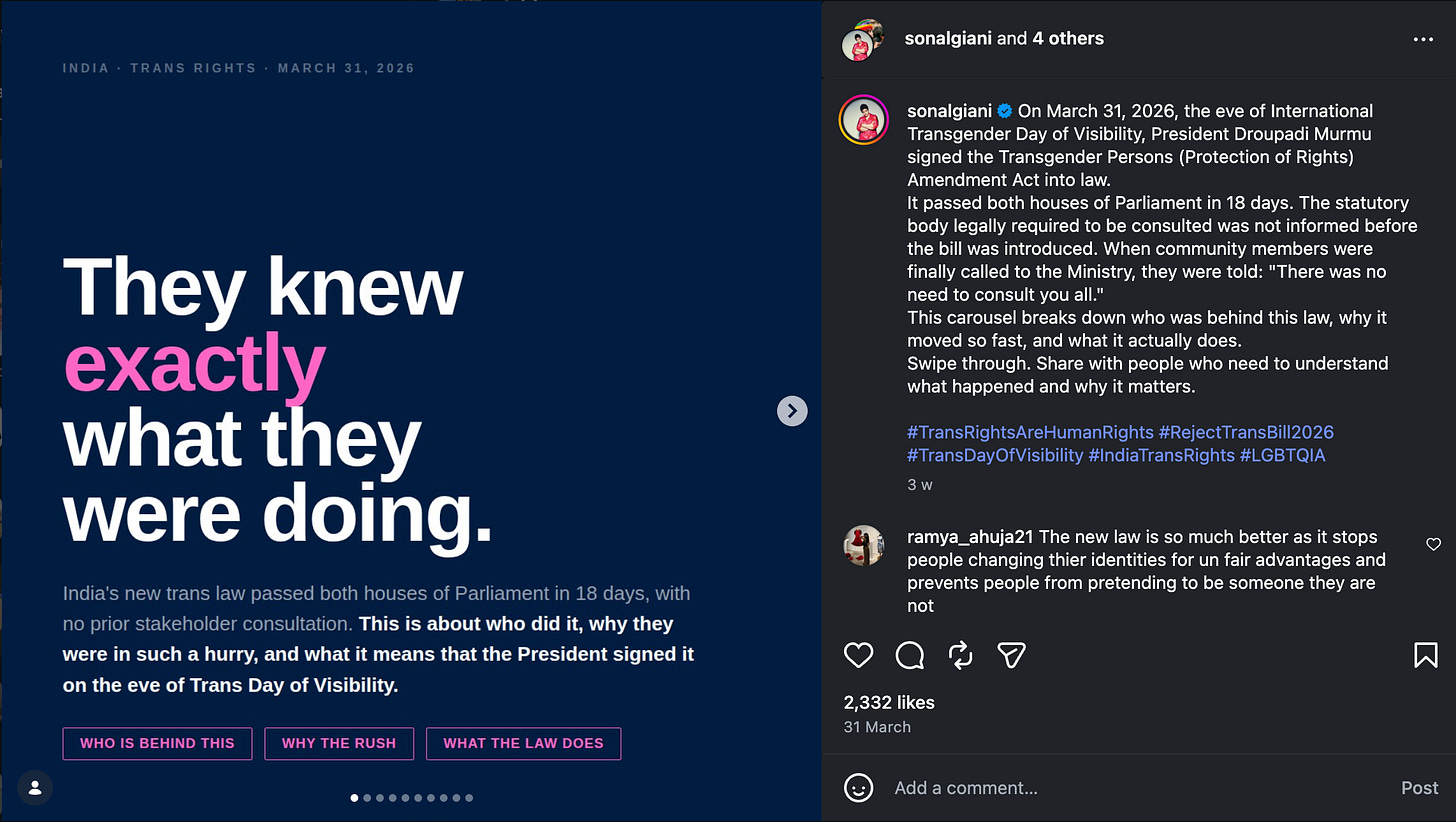 If this Bill becomes law, India will move from a framework built on self-determination to one built on state medical gatekeeping, with the language of crime wrapped around ordinary gender-affirming care. It is one of the most significant regressions for trans rights anywhere in the world this year, and it deserves far more international attention than it is currently getting.