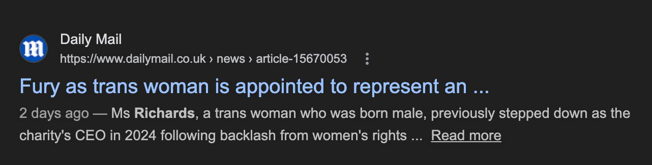 Civil Society: Health charity CEO steps down after transphobic reactions to appointment (2024): https://www.civilsociety.co.uk/news/health-charity-ceo-steps-down-after-transphobic-reactions-to-appointment.html