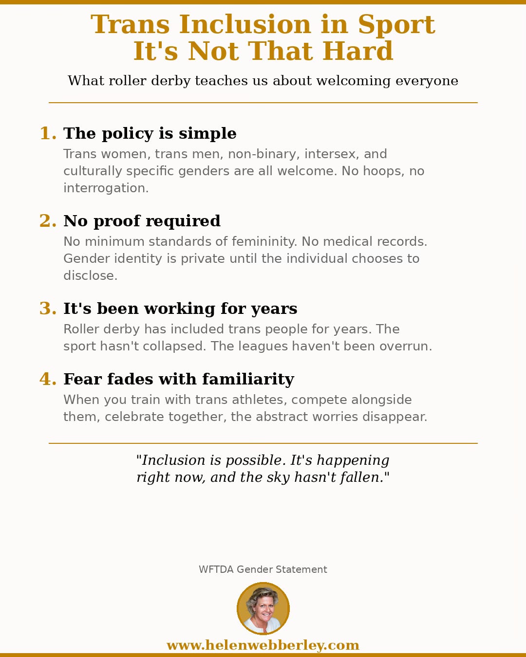 The WFTDA policy shows that inclusion doesn’t have to be complicated. You don’t need endless committees debating testosterone levels or demanding medical records. You simply need to decide, as an organisation, that you value inclusion and that you’re willing to trust people to participate honestly.